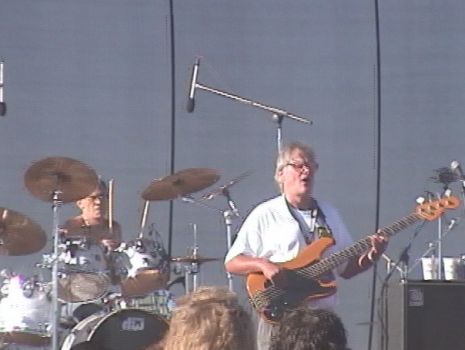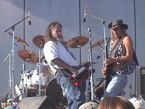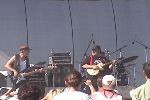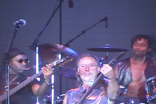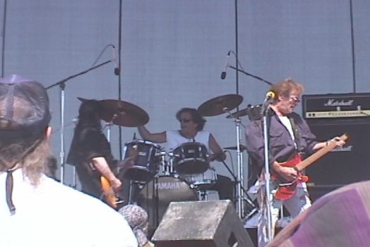 таки "вытряхнул нас из носков". Как сейчас помню давнишнюю заметку о героях Вудстока, группе Mountain, начинавшуюся такими словами: "Еще не улеглась пыль, поднятая The Cream, как они снова тут..." Крутой рок классического трио, двое из которых - ветераны, и для того, чтобы просто посмотреть на Лесли Уэста (бывшего когда-то той самой "горой", но сильно похудевшего за последние 30 с небольшим лет) – стоило подняться знойным воскресным утром пораньше, а тут и ударник Корки Лэнг, еще в 60-х снискавший эпитет "легендарный" и игравший со всеми тогдашними знаковыми величинами, от Эрика Клэптона до Мика Ронсона, остается таковым и по сей день. Третий участник, басист Ричи Скарлетт служил естественным фоновым дополнением и не мешал изливаться энтузиазму.