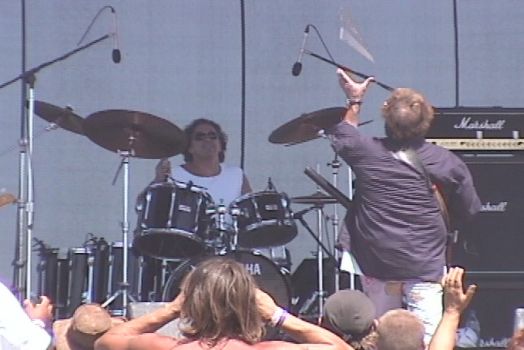 Лэнг барабанил так, словно на дворе был не жаркий ютинский воскресный полдень 21 века, а прохладные калифорнийские сумерки конца 60-х. Он один оглушающе приковал внимание публики, разбрасывая вокруг и, главное, впереди себя во время зубодробительных соло несметное количество барабаных палочек – трюк, явно изобретенный на заре шоу-бизнеса и с тех пор многократно оттачиваемый.